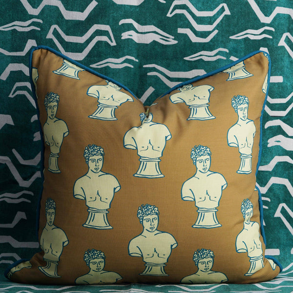 The Adonis pillow cover from Post House elevates your space with a nod to classical artistry. Featuring a repeating Greco-Roman head sculpture motif rendered in refined fabric, this design exudes historical resonance with contemporary elegance. Available in sizes from 20″ to 26″ (and a 14 × 22″ lumbar), with options for knife edge or cording—and a choice of navy blue or sepia piping